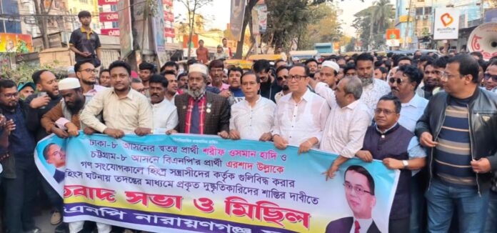 শনিবার ( ১৩ ডিসেম্বর) বিএনপি নারায়ণগঞ্জ মহানগর আয়োজিত এক প্রতিবাদ সভা ও মিছিলের মাধ্যমে নেতৃবৃন্দ এ ঘটনার নিরপেক্ষ ও দ্রুত তদন্তের দাবি জানান এবং প্রকৃত দুষ্কৃতিকারীদের অবিলম্বে গ্রেপ্তার করে দৃষ্টান্তমূলক শাস্তি নিশ্চিত করার আহ্বান জানান। সভায় বক্তারা বলেন, নির্বাচনকে প্রশ্নবিদ্ধ করা এবং বিরোধী মতকে দমন করতেই পরিকল্পিতভাবে এ ধরনের সহিংসতা চালানো হচ্ছে, যা গণতন্ত্র ও আইনের শাসনের পরিপন্থী।