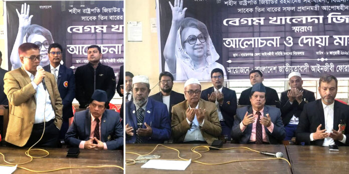 সাবেক প্রধানমন্ত্রী ও বিএনপি চেয়ারপারসন বেগম খালেদা জিয়ার মৃত্যুতে গভীর শ্রদ্ধা ও তার বিদেহী আত্মার মাগফিরাত কামনায় নারায়ণগঞ্জ জেলা জাতীয়তাবাদী আইনজীবী ফোরাম এক আলোচনা সভা ও দোয়া মাহফিলের আয়োজন করেছে। গতকাল বৃহস্পতিবার (৮ জানুয়ারি) দুপুরে নারায়ণগঞ্জ জেলা আইনজীবী সমিতির ‘ডিজিটাল বার ভবন’ নিচতলায় এই কর্মসূচি অনুষ্ঠিত হয়। আলোচনা সভা ও দোয়া মাহফিল শেষে উপস্থিত আইনজীবীদের মাঝে তবারক বিতরণ করা হয়।